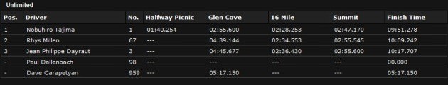 Pilotul francez Jean Philippe Deyraut, la volanul unui Duster de 850 CP, a încheiat cursa în 10:17.707, cu peste 25 de secunde în spatele japonezului!