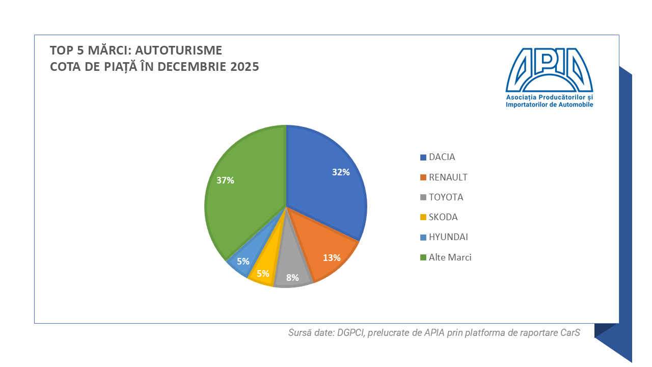 I. Autoturismele (care reprezintă aproximativ 88% din total piață) au înregistrat, în luna decembrie 2025, un volum de 21.203 unități, cu +58.4% mai mult față de luna similară din 2024.