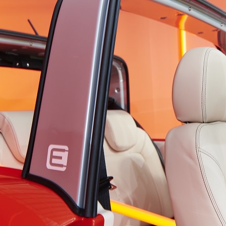 Cele 4 nuante de caroserie realizate din plastic termoformat, cu pigment de culoare in toata masa materialului, rezistent la coroziune si socuri usoare, pot dispune, dupa caz, de doua variante de plafon soft (negru si orange) si de doua finisari interioare (beige sau orange, al caror imprimeu in partea centrala este inspirat din lumea sporturilor nautice). Fabricate din polimeri de tip TEP, aceste tapiterii sunt complet impermeabile.