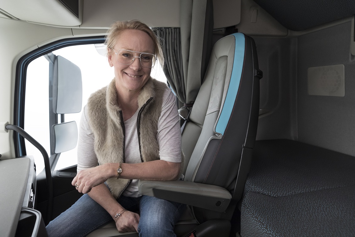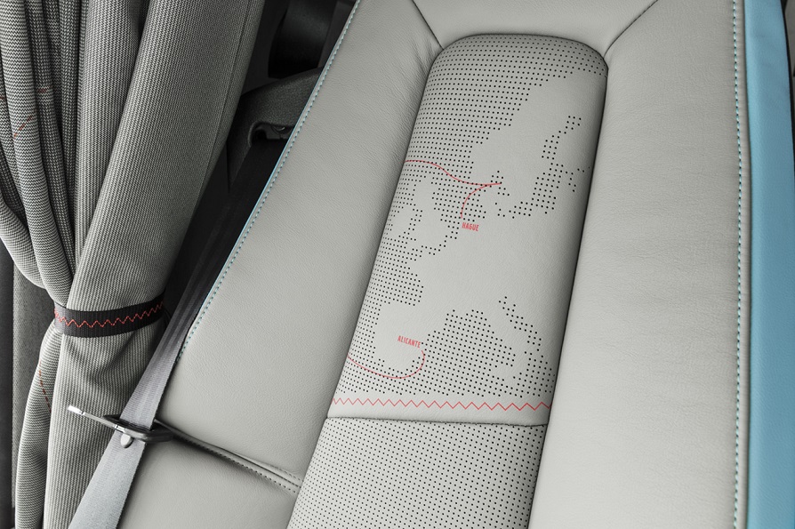 Interior cald. Motivele unitare de culoare și design își găsesc ecoul și în mediul de lucru al șoferului, care combină confortul premium cu materialele de înaltă calitate și cu atenția la detalii. Treapta de acces, mânerele de susținere, panelurile ușilor, covorașele, volanul, compartimentele de depozitare și elementele textile, toate au fost proiectate în conexiune cu marea și navigația. De exemplu, scaunul șoferului, ventilat, este tapisat în piele naturală de culoarea nisipului, cu accente albastre și cusături roșii discrete, în zig zag. Spătarul este decorat cu o hartă care indică porturile de start și de sosire pentru ediția din acest an a cursei Volvo Ocean Race. Aceeași hartă stilizată este reprodusă pe draperii, iar manșetele acestora copiază designul în zig zag al cusăturilor.