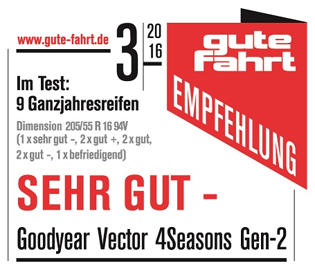 [3] Gute Fahrt Test 205/55 R 16, test comparativ desfășurat cu anvelope all-season pe un Audi A3 TDI-Limousine. Publicat în martie 2016, Nr. 3, 2016. www.gute-fahrt.de. Test comparativ cu anvelopa Goodyear Vector 4Seasons Gen-2 (94V) împotriva anvelopelor Conti EcoContact 5 (91V), Dunlop Winter Sport 5 (91H), Michelin CrossClimate (94V), Nokian Weatherproof (91H), Pirelli Cinturato All Season (91V) și Uniroyal All Season Expert (91H).