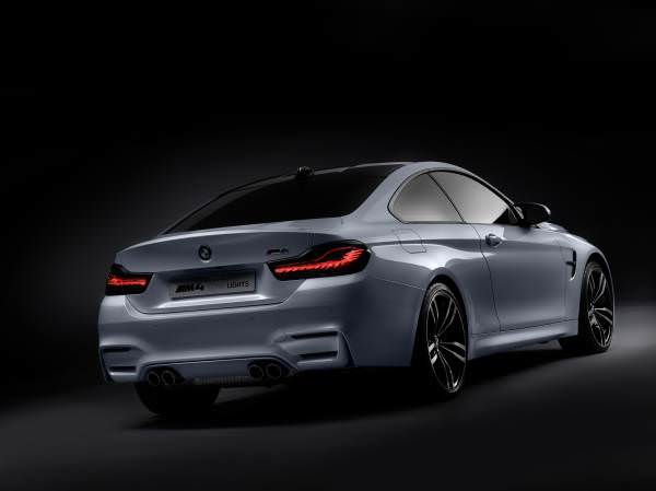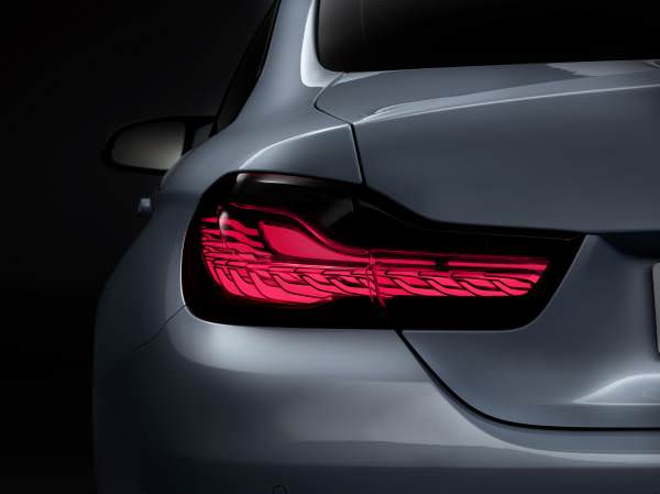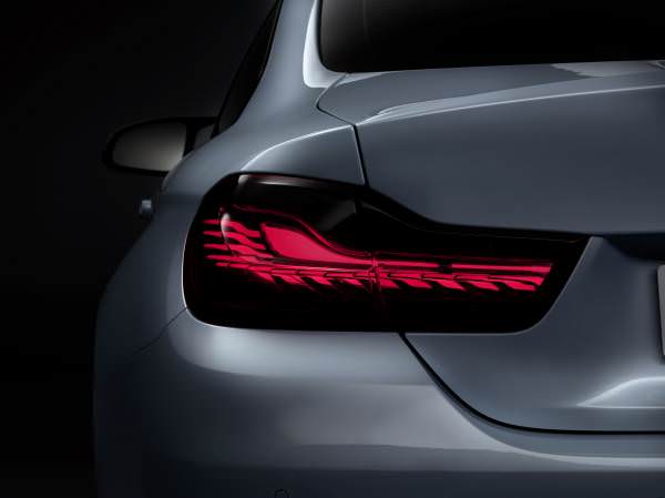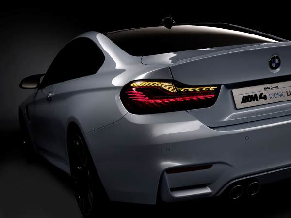 În trecut, cerinţele legale riguroase prin care se reglementa luminozitatea surselor de lumină ale automobilului, au limitat numărul funcţiilor de iluminare care făcea posibilă implementarea tehnologiei OLED. La modelul BMW M4 Concept Iconic Lights tehnologia este utilizată la stopuri şi la semnalizatoarele spate. Prin activarea individuală a segmentelor OLED, este posibilă crearea unor efecte diferite de iluminare în funcţie de diferite moduri de condus. În timp ce forma obişnuită a literei L este iluminată larg şi uniform, în modul Sport poate fi utilizat un tipar diferit de iluminare prin activarea doar a unor segmente OLED. În acest caz, stopurile apar ca „benzi” de lumină înguste, concentrate şi bine definite.