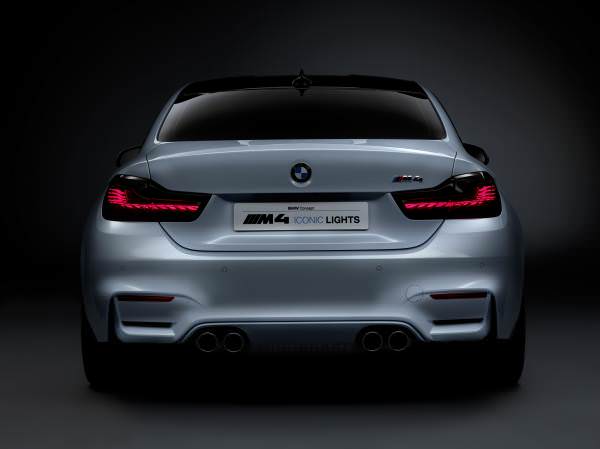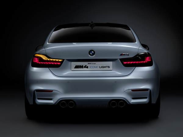 Modelul BMW M4 Concept Iconic Lights, cu caroseria vopsită în nuanţa Cool White metalizat, oferă o nouă interpretare a farurilor rotunde duble specifice BMW. În mişcare, tehnologia laser poate fi identificată de benzile fine de culoare albastră din interiorul farurilor. Totodată, stopurile modelului BMW M4 Concept Iconic Lights se bazează pe tehnologia OLED (LED-uri organice) care produce lumina din straturi semiconductoare de material organic de câţiva milimetri grosime. În premieră, stopurile şi semnalizatoarele spate dispun de tehnologie OLED. Suprafeţele iluminate sunt poziţionate astfel încât să producă efect tridimensional. OLED-urile au avantajul că deschid noi posibilităţi pentru designeri prin dimensiunile foarte compacte.
