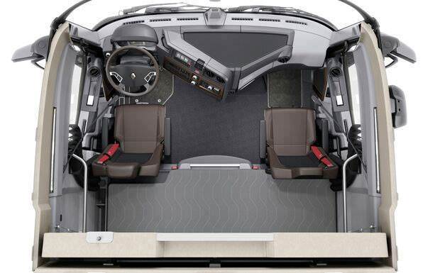 Noua gamă “Distanţe lungi” oferă numeroase beneficii fără precedent. Cu o lăţime de 2,5 metri, cabina Renault Trucks T este mult mai spaţioasă, mai confortabilă şi are un pat extensibil, precum şi un pat superior care poate fi folosit la nevoie pentru depozitare suplimentară. Tunelul motor are acum o înălţime de doar de 200mm şi este complet încorporat în cazul cabinelor cu podea plată. Poziţia optimizată de condus este dată de noile scaune proiectate de RECARO ® pentru Renault Trucks, un tablou de bord ergonomic cu ecran central de 7 inci (cel mai mare de pe piaţă), precum şi opţiunea de reamenajare a poziţiei butoanelor de control. T oferă, de asemenea, un compartiment de depozitare care poate fi accesat atât din interiorul cât şi din exteriorul vehiculului, plus o uşă cu deschidere la un unghi de 85°. Şoferul are avantajul unor dispozitive de siguranţă, inclusiv lumini la viraje şi un volan multifuncţional reglabil pe trei poziţii.