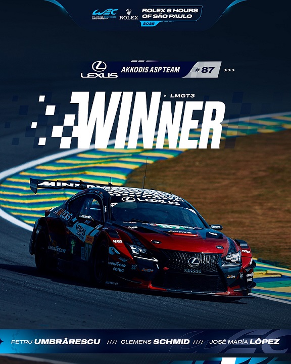 Performanță extraordinară la Sao Paulo (Brazilia) pentru Petru Umbrărescu, care a devenit primul pilot român câștigător într-o etapă din Campionatul Mondial de Anduranță. Alături de colegii săi de la Akkodis ASP Team – María López și Clemens Schmid -, pilotul român a terminat cursa de 6 ore pe primul loc la clasa LMGT3, potrivit fras.ro.